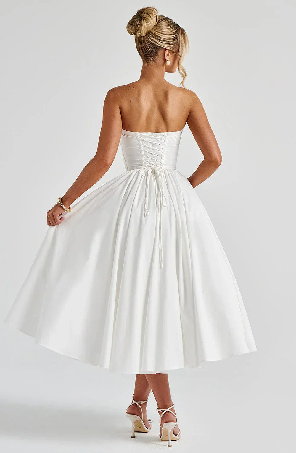 The Prim Midi Dress in ivory is a stunning blend of sophistication and allure, perfect for making a statement at any special occasion. This strapless design features a plunging sweetheart neckline that beautifully frames the décolletage, accented by a decorative bow between the cups for a charming touch. The boned corset overlay and underwired pleated cups deliver support and structure, ensuring a flattering fit. The romantic lace-up back allows for an adjustable finish, while the gathered full skirt flows gracefully from the waist, creating a timeless and effortlessly chic look.