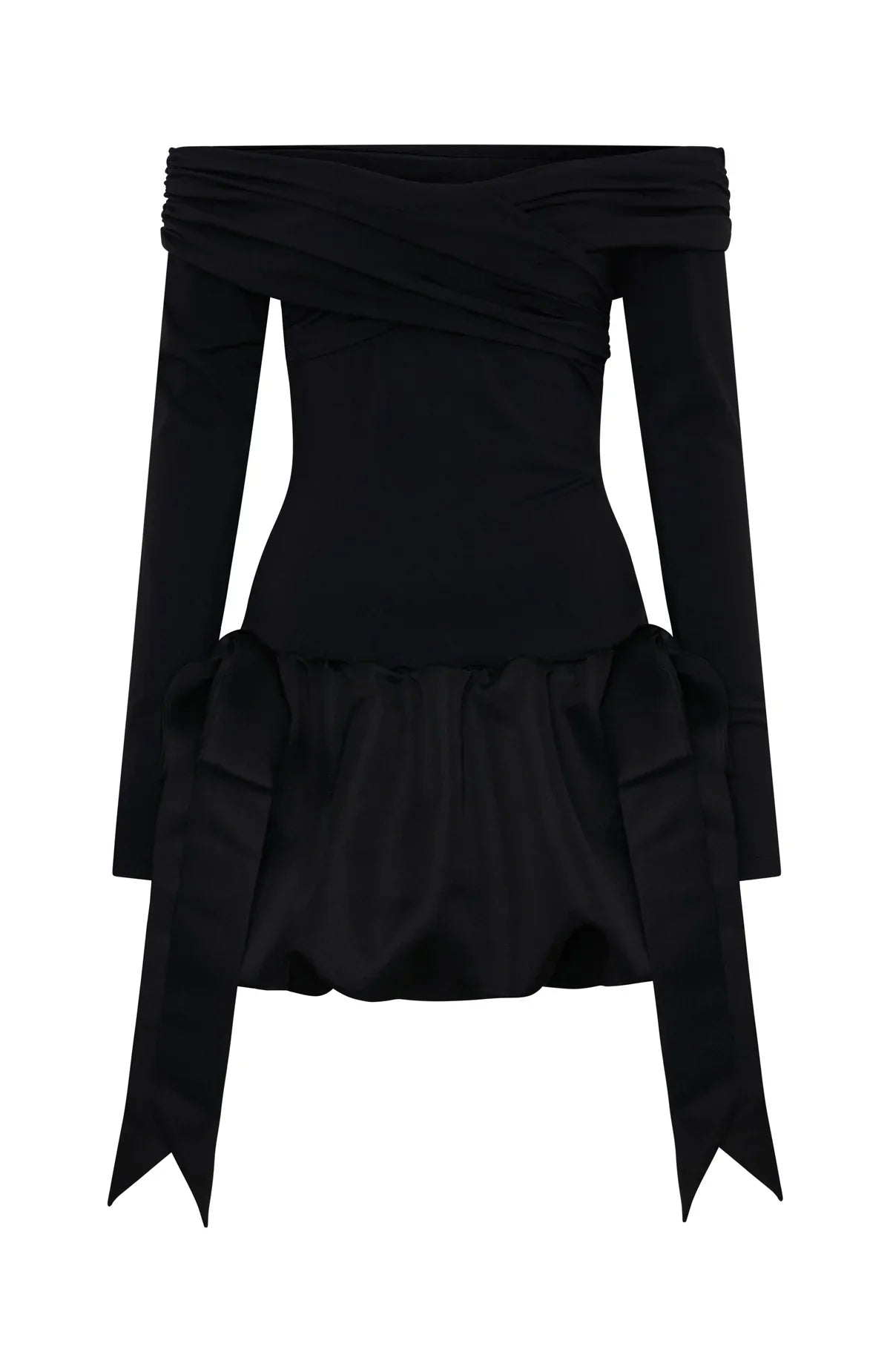 Totally sleigh your fit in the Raise Hell Long Sleeve Mini Dress in Black! Features an off-the-shoulder neckline with a chic fold-over detail, elegantly draped over long sleeves. The fitted bodice hugs your shape before falling into a playful drop-waist bubble skirt finished with a statement bow. Fully lined for comfort. Style it with sky-high heels and eye-catching jewellery for your next xmas event.