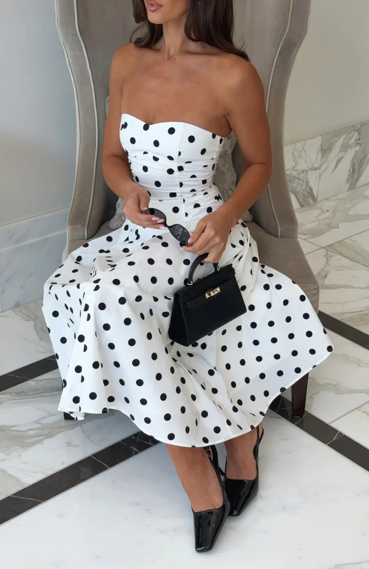 We have fallen in love! The Rich In Love Strapless Maxi Dress in White/Black Polka Dot features a strapless neckline, bust cups, ruched panelling to define the waist, pleated skirt for volume, invisible zipper with hook and eye closure centre back and lined. Team with a simple heel and paired back gold jewellery for a timeless look!