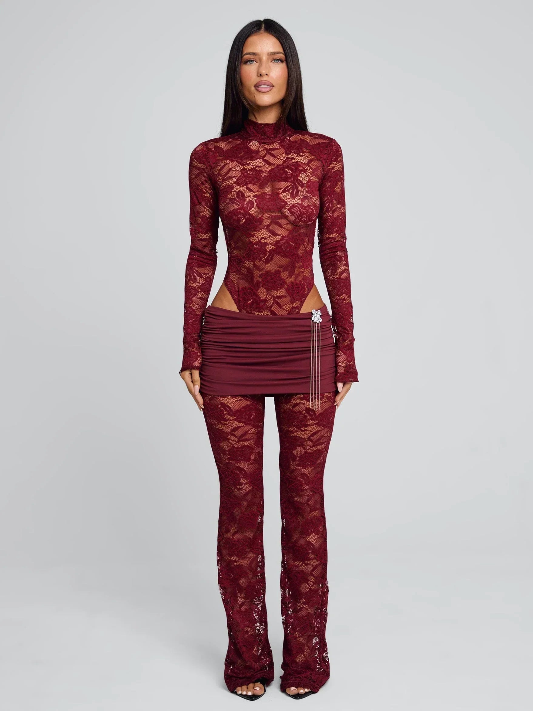Cut from delicate floral lace that’s sheer enough to feel dangerous yet perfectly placed for mystery, she sits high on the waist and flares gently from mid-thigh into a soft, leg-lengthening kick. A detachable crystal brooch pins at the waist like stolen jewellery, catching light (and breath) with every step. Deep wine red glows against skin like spilled merlot at midnight; romantic, expensive, impossible to ignore.