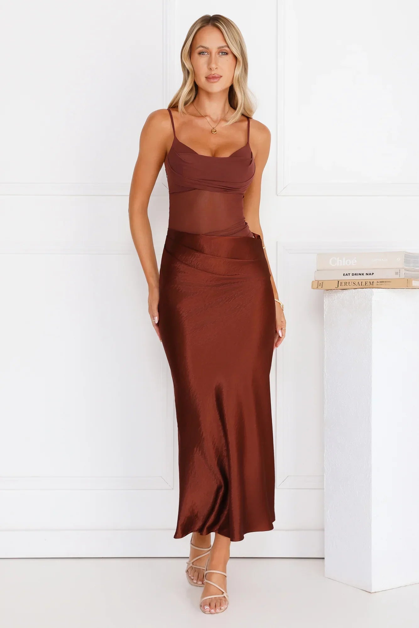 The Rule The Glow Satin Mesh Maxi Dress is your go-to for effortless charm, featuring a mesh top with a cutout to the waist and a silky skirt. Style with heels.