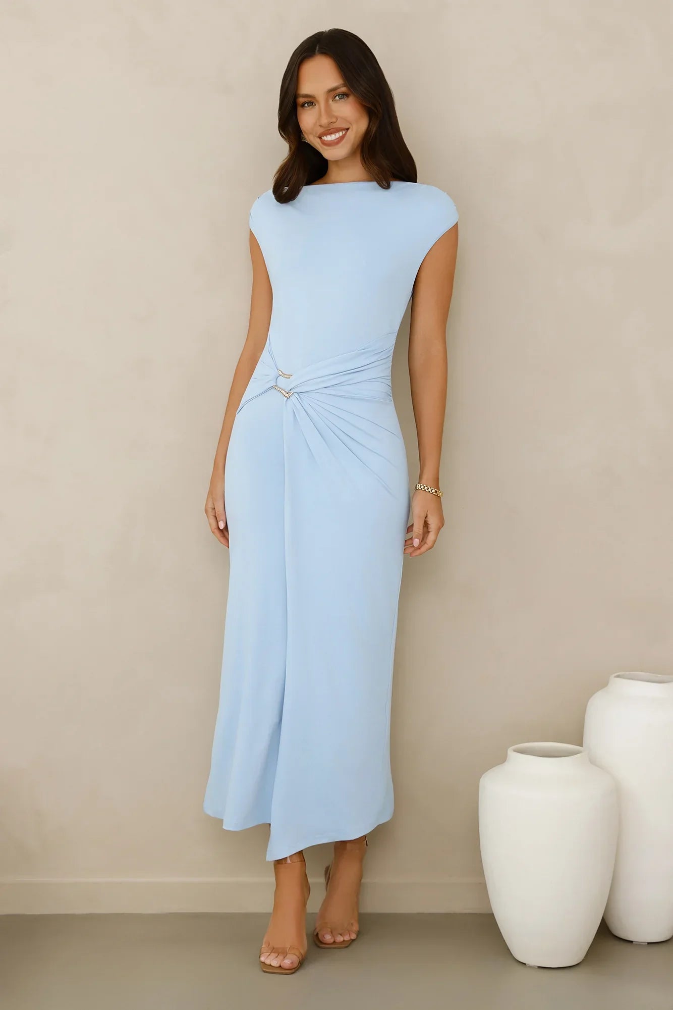 Step into effortless elegance with the Runway Icon Maxi Dress! Designed to flatter, this stretch maxi dress features a chic wrap detail on the skirt with a gold accent. This show-stopping piece is your go-to for making a statement. Style with heels.