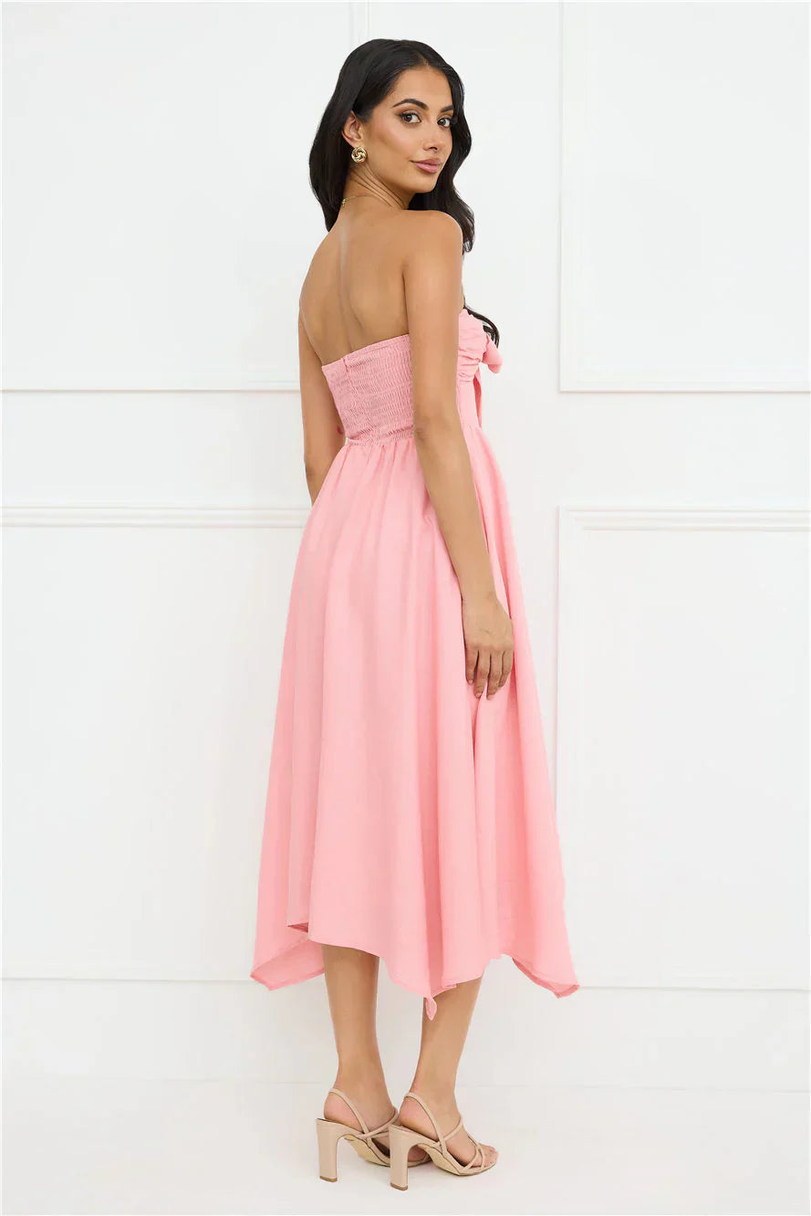 Embrace your free spirit in the Saltwater Soul Strapless Midi Dress, with a stunning asymmetric hem, a tie to the neckline, a flowy skirt, and an elastic back that gives you both comfort and style for those sun-kissed days. Style with sandals.