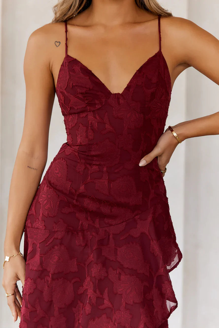 Stylish, timeless and perfect for your next party. The Sapphire Cascade Midi Dress features a gorgeous asymmetric frill skirt, a pretty pattern to the fabrication and a dreamy hue. Style with heels for all the attention.