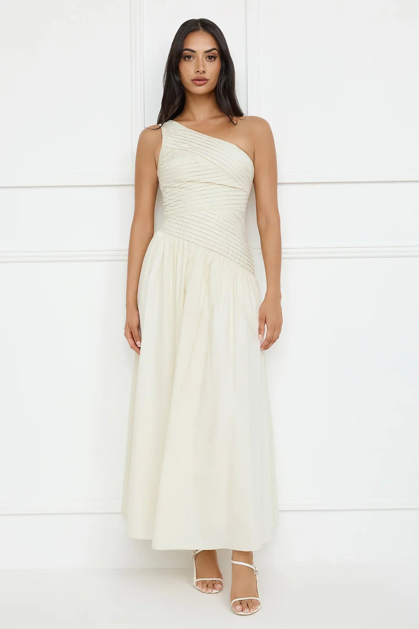The Seashell Moments One Shoulder Maxi Dress features a flattering one-shoulder design, with a pleated bodice and a flowy skirt that moves with every step—perfect for creating an effortlessly chic look. Style with heels.