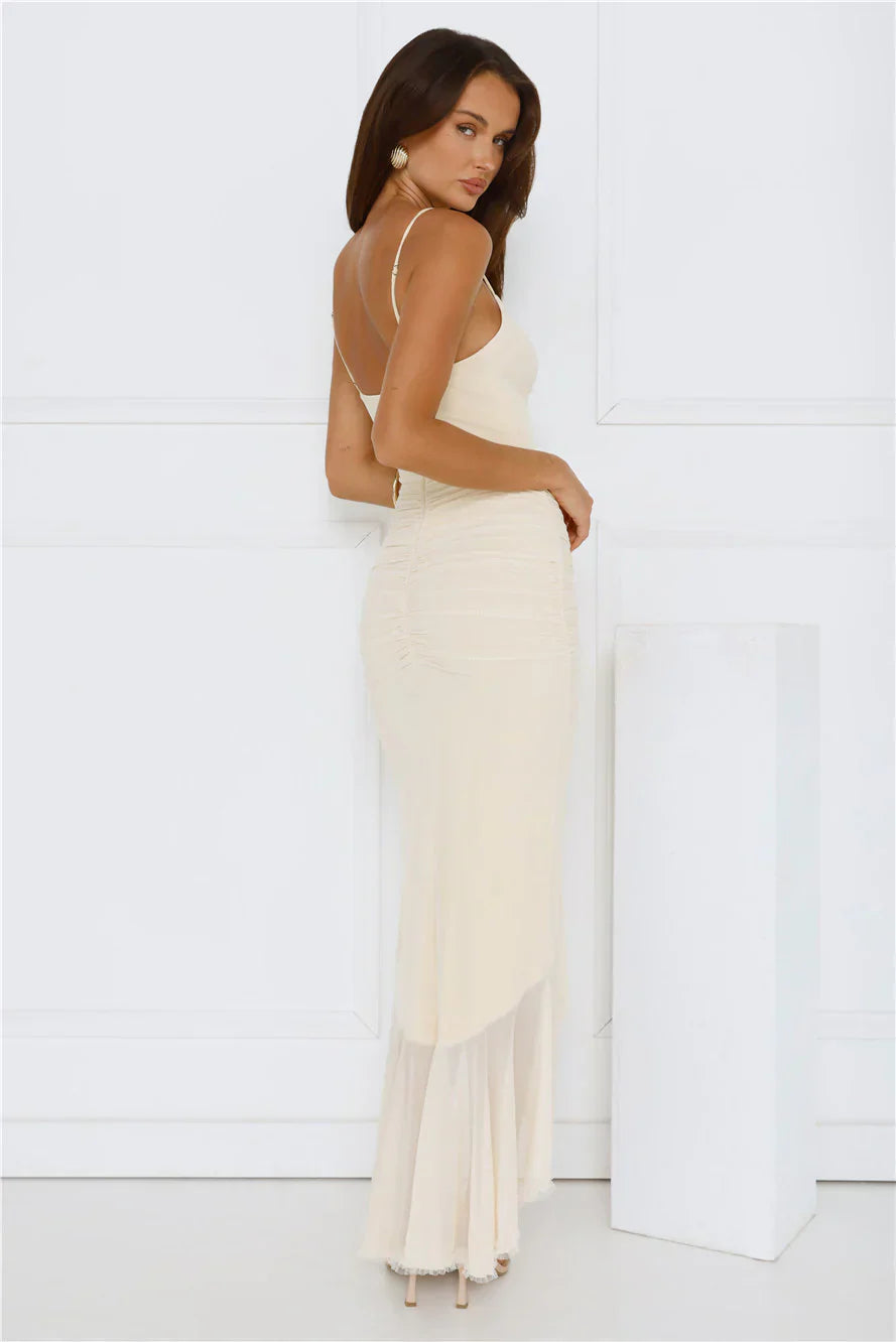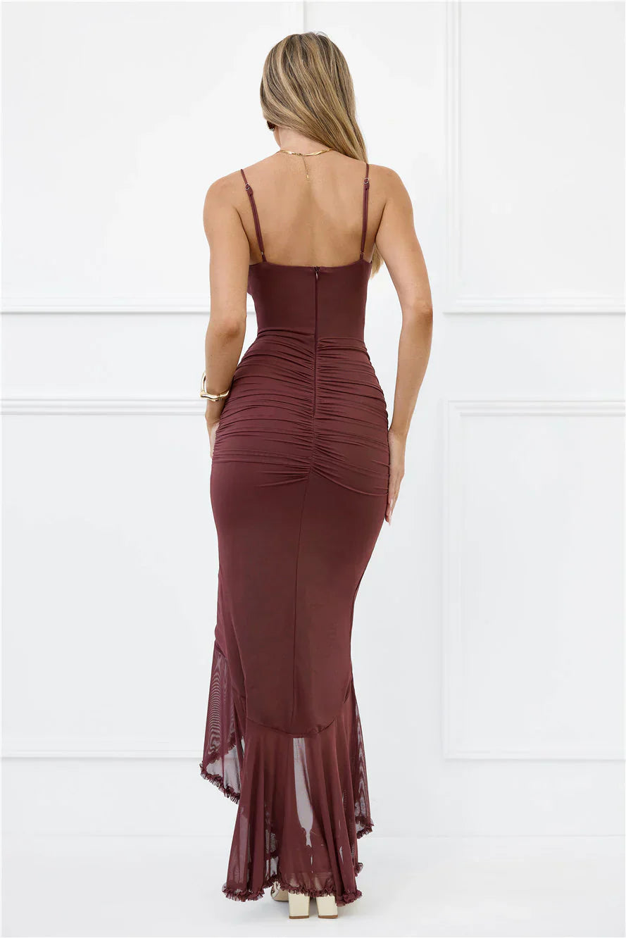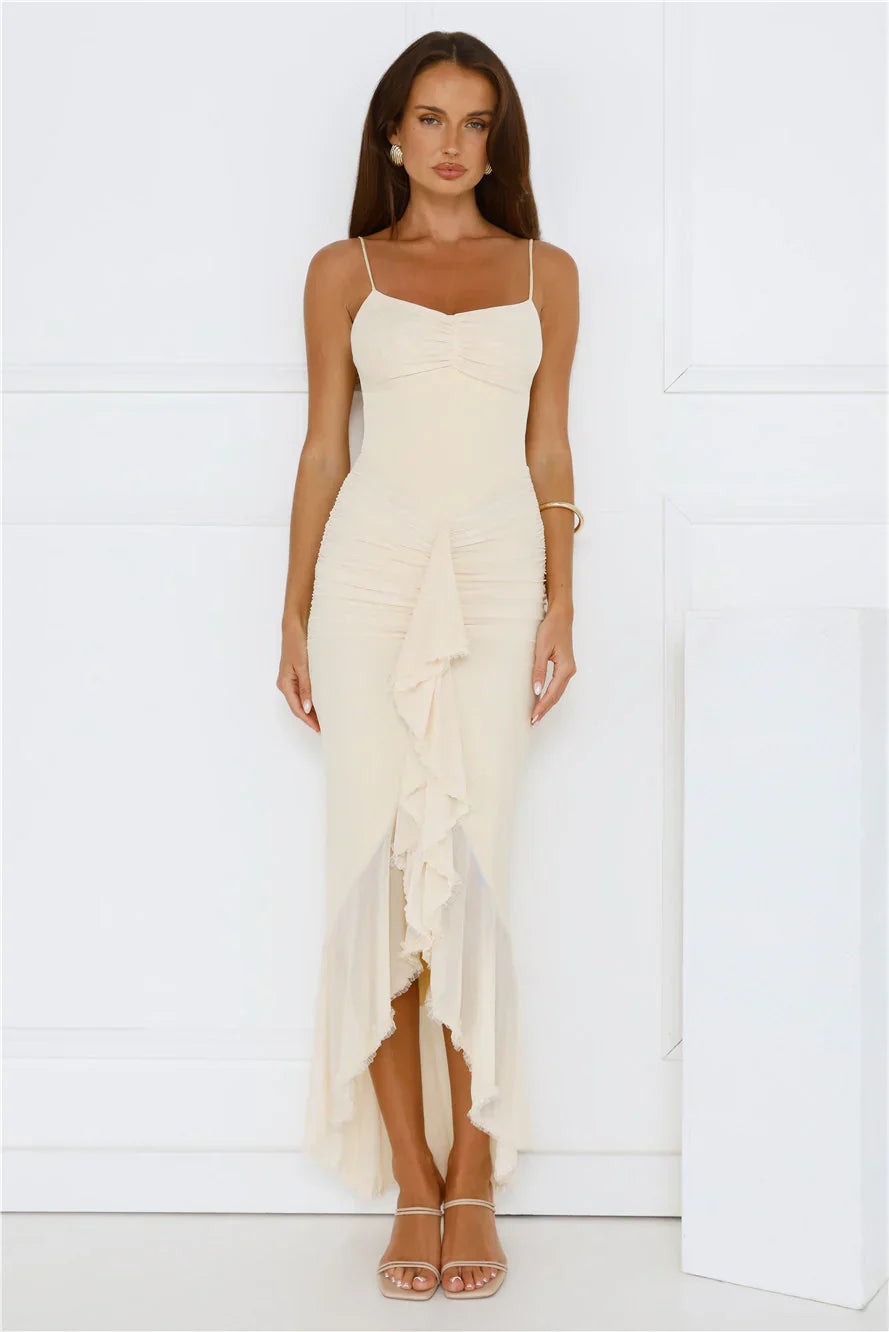 The Shimmer In The Dark Mesh Maxi Dress features a stretchy mesh fabric with frill details and a stylish high-low skirt for an effortlessly chic look. Perfect for an evening out, style it with your favourite heels for a glam statement.