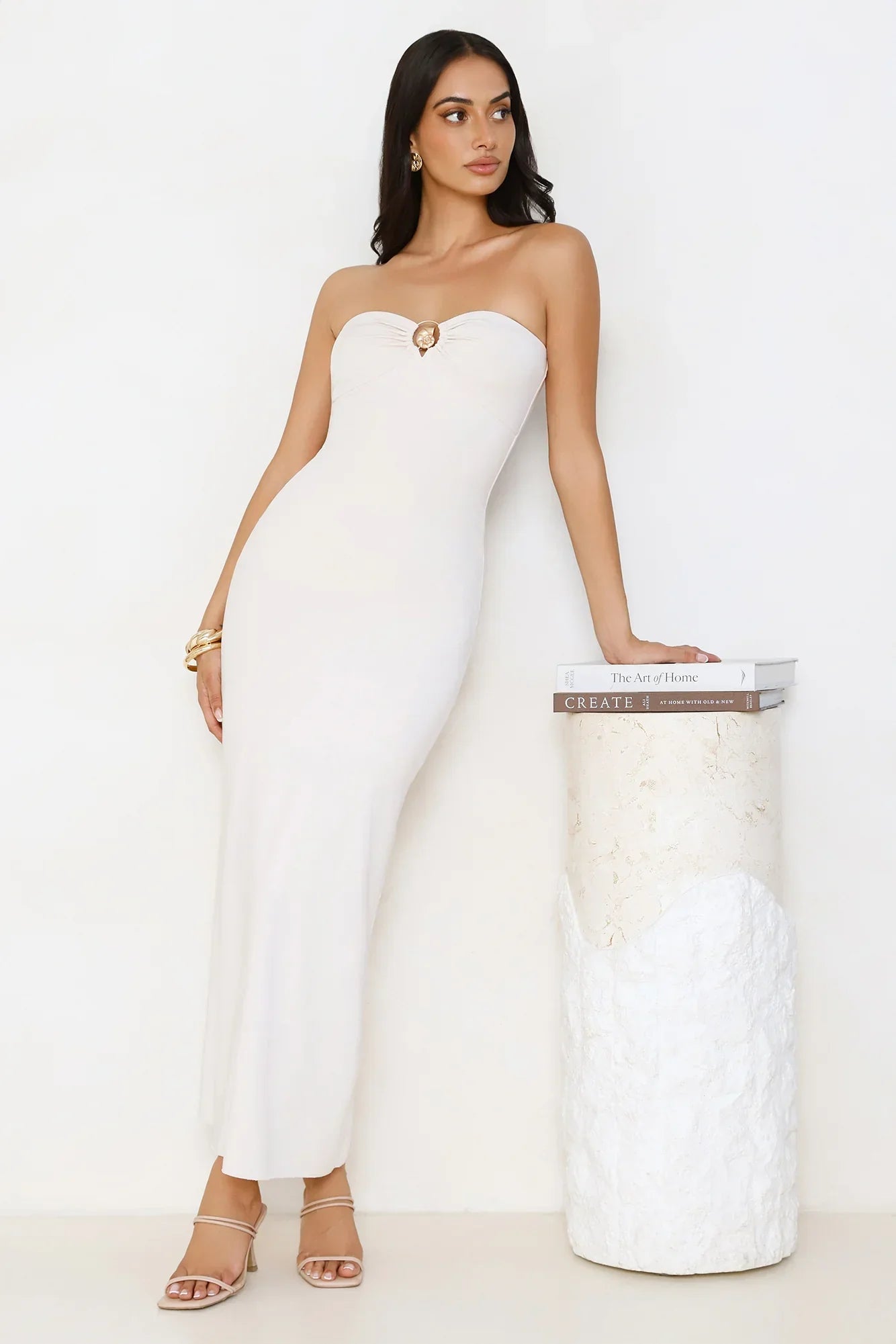 The Simple Sunshine Strapless Maxi Dress exudes effortless elegance with its strapless design, gold seashell detail at the neckline, open back, and tie closure. Style with heels for your new fave 'fit.