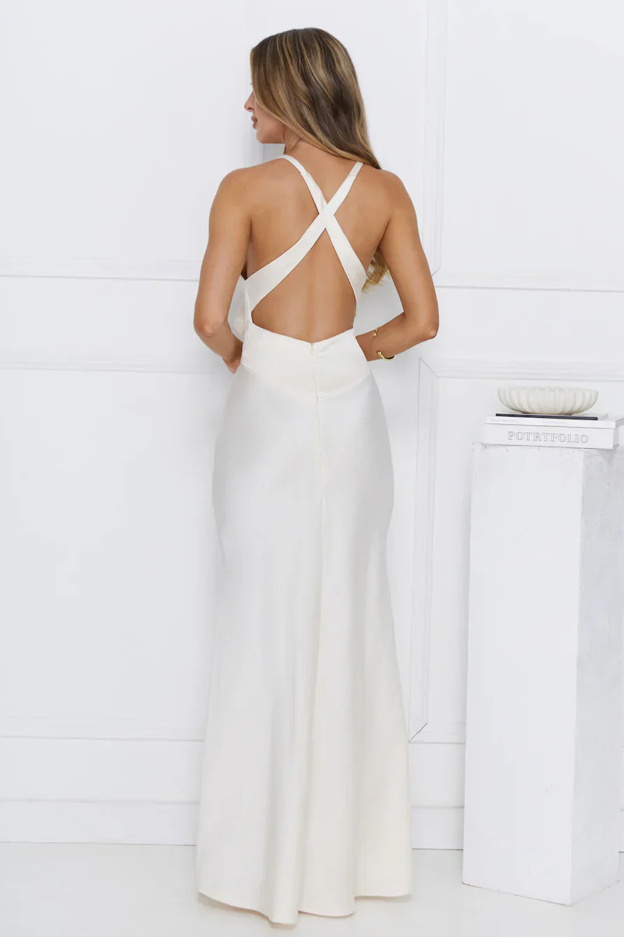 Style the Simply Sophisticated Maxi Dress for events that deserve a little extra dazzle. Featuring a gorgeous textured silhouette, a rosette detail to the front and a crisscross back. Style with heels and curls!