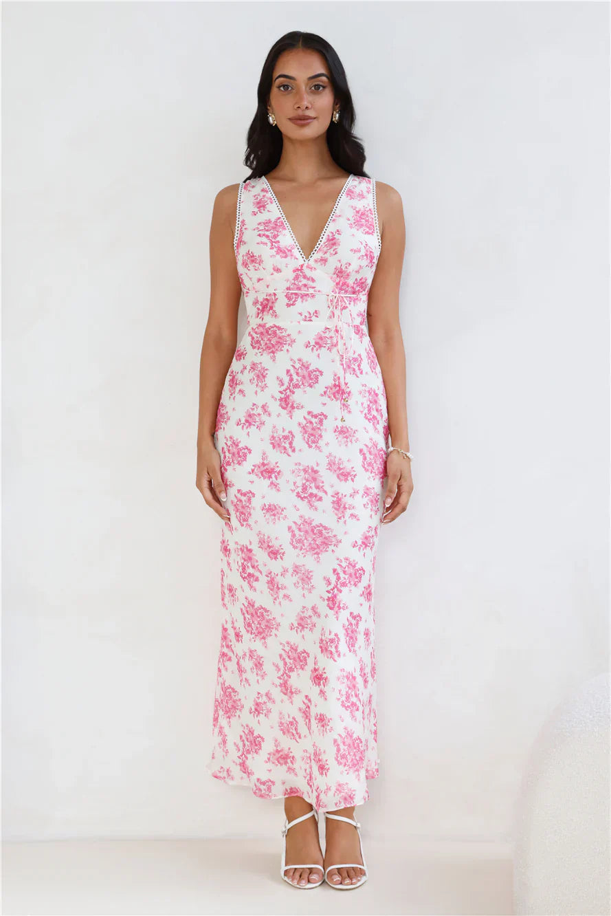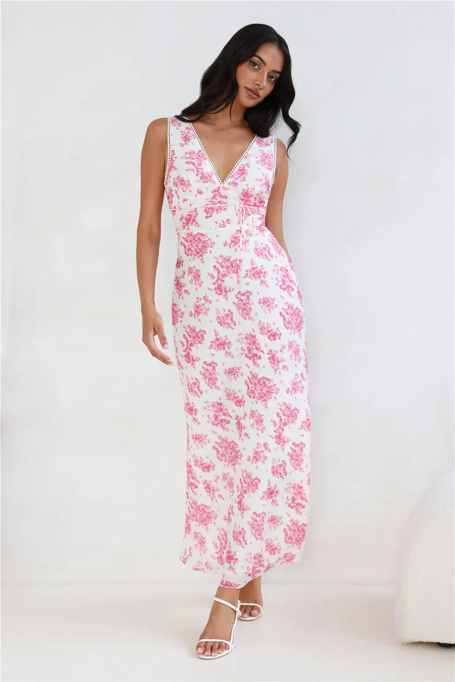 You're going to love the fit of this dress, lovely. The Soft Florals Maxi Dress features a gorgeous blue print, a straight, flowy skirt and a waist tie. Style with heels and curls for all the likes.