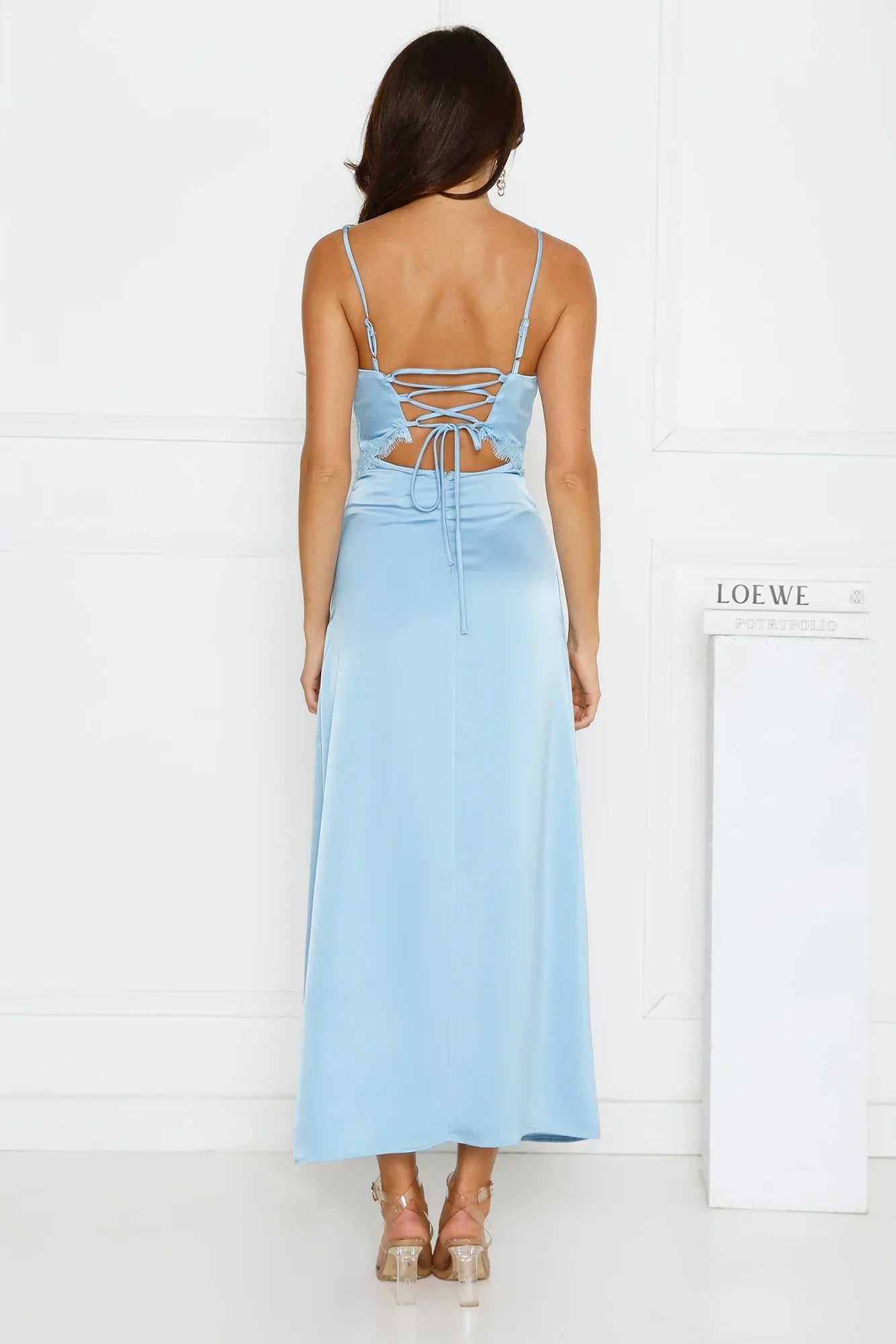 The Softly In Season Satin Maxi Dress brings elegance with its satin finish, delicate lace details, faux button front, sheer bodice, and a crisscross back — perfect for glowing golden moments. Style with heels.