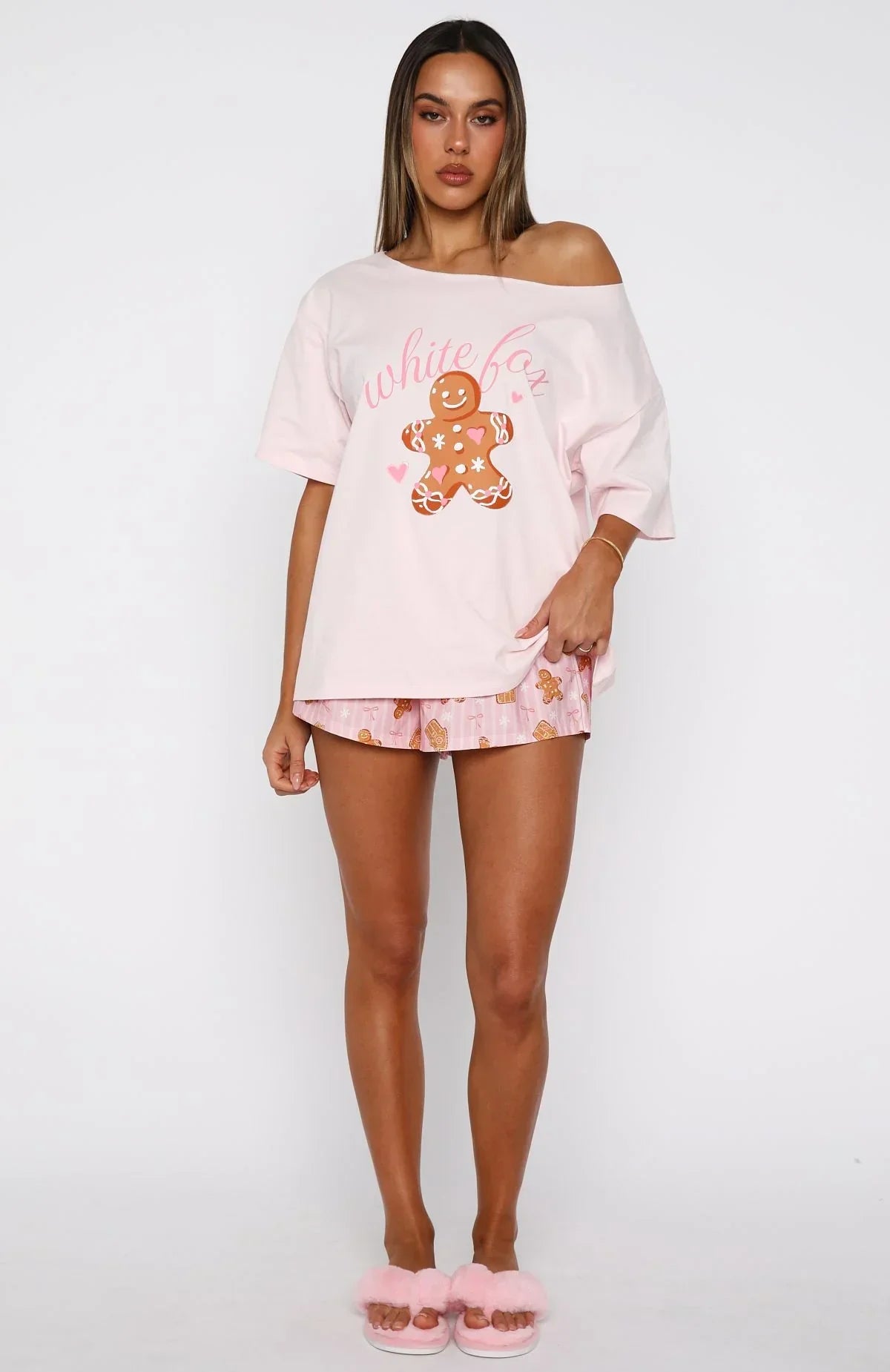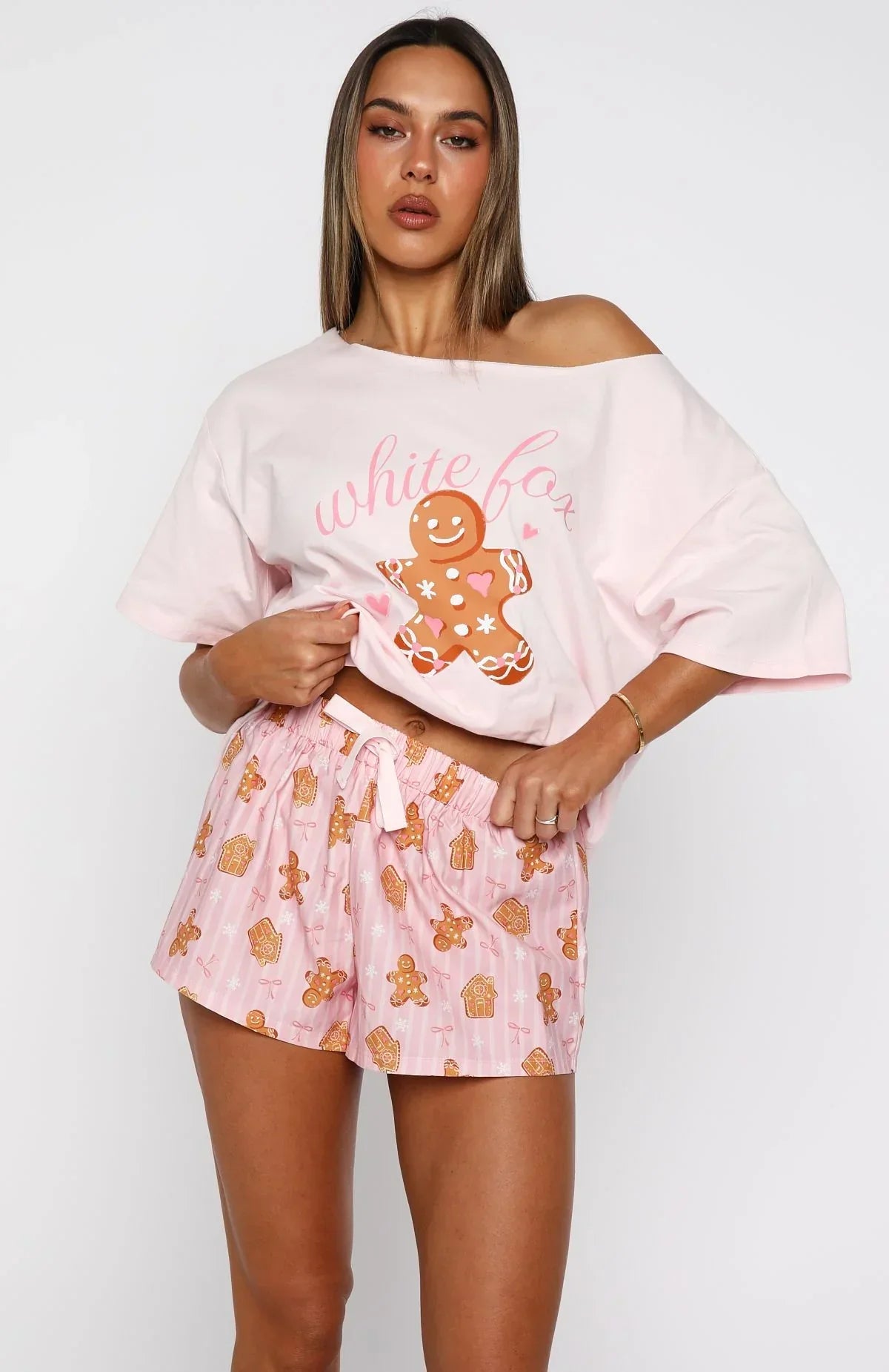 The Sweetheart Pyjama Short in Gingerbread Twist adds a festive touch to your bedtime routine. Designed with a thick elasticated waistband, self-tie drawstring and Christmas inspired pattern. The straight-leg cut and unlined, lightweight material provide breathability and ease. Pair it with the Sweetheart Pyjama Off Shoulder Tee Soft Pink.