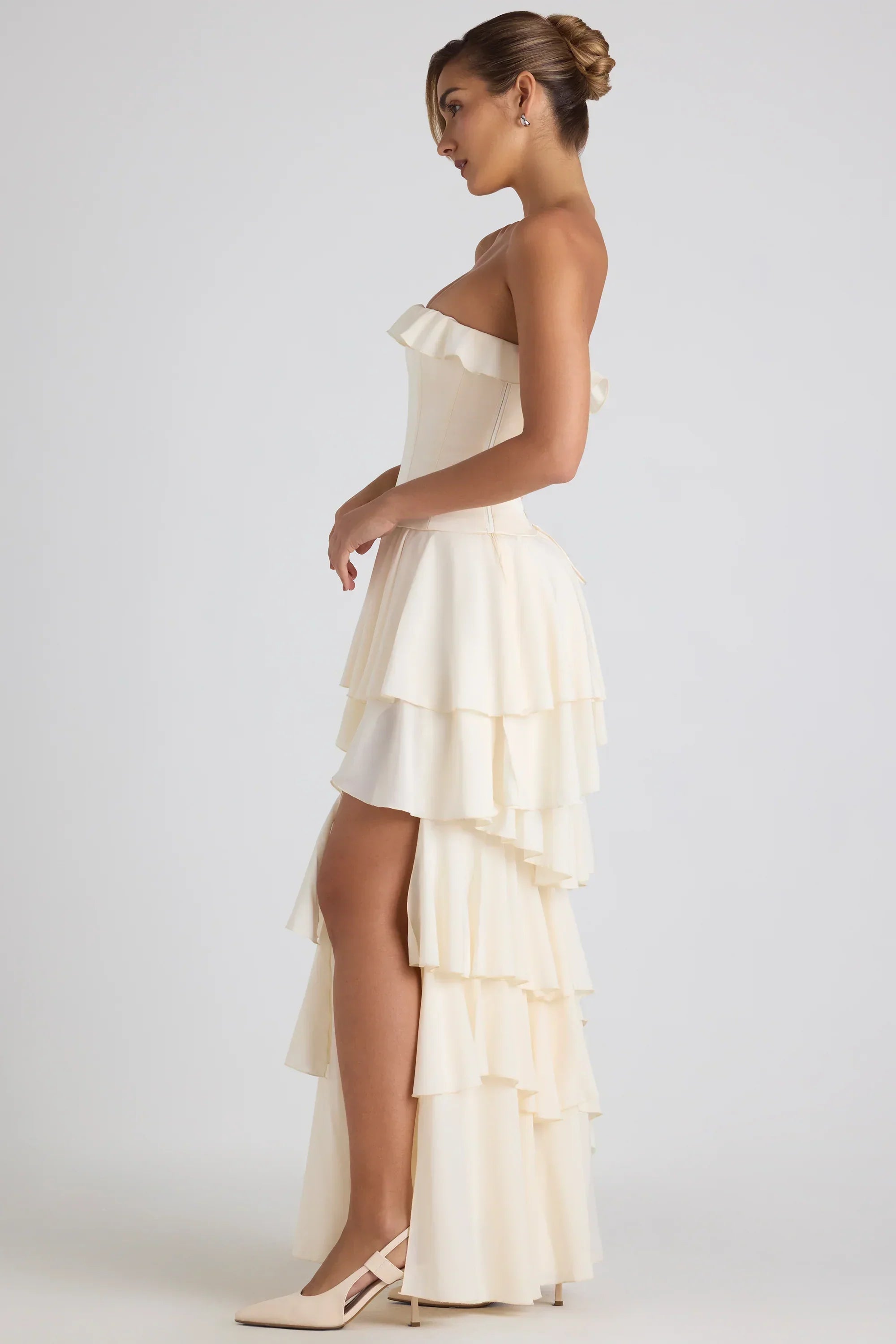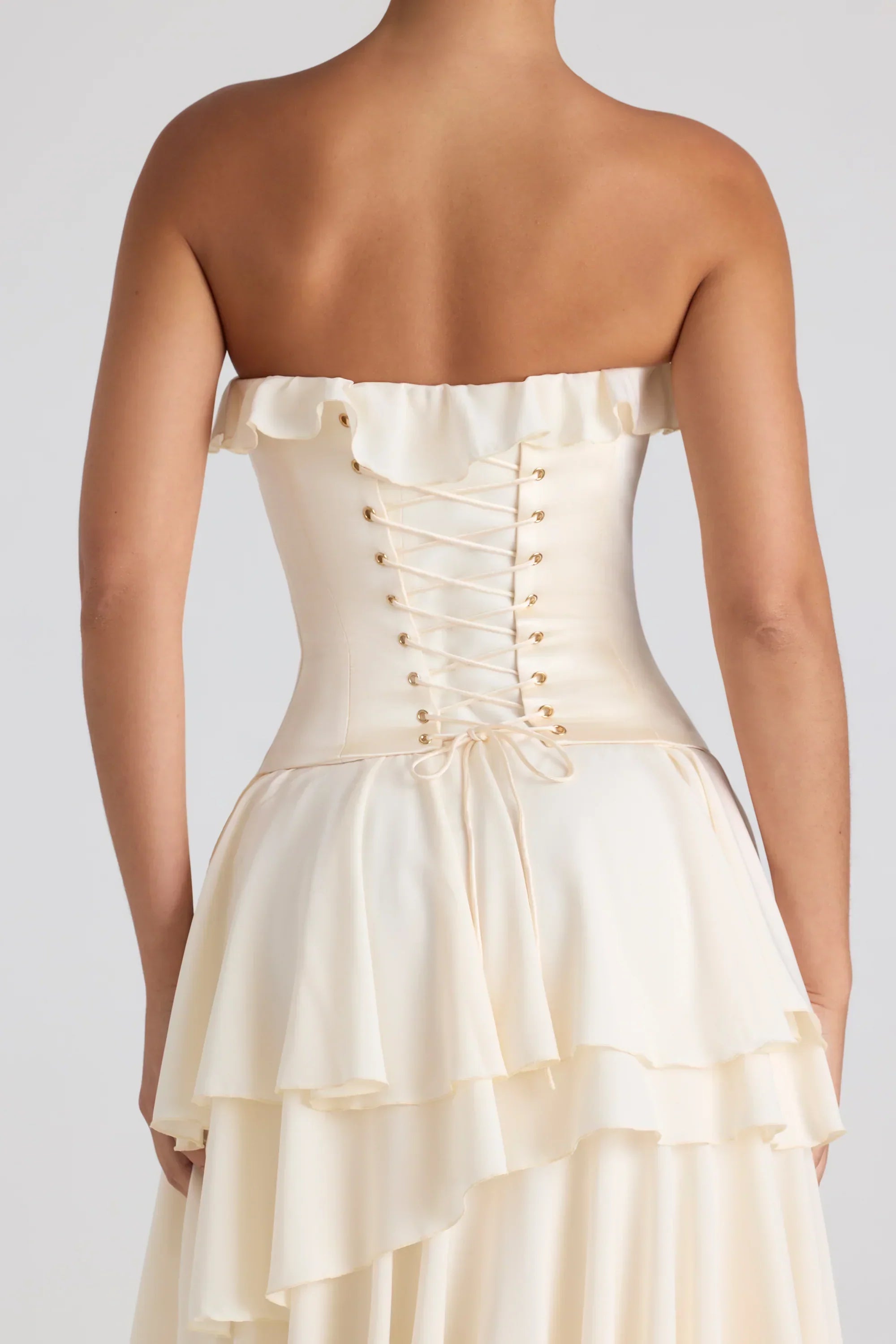 Inspired by tales of romance. The Selene gown is a stunning convertible style, complete with a detachable lace-up satin corset for custom styling. It’s crafted from layers of georgette to an asymmetric tiered silhouette with a thigh-high split. The strapless ruffle-trim neckline is complete with internal silicone taping for enhanced hold.
