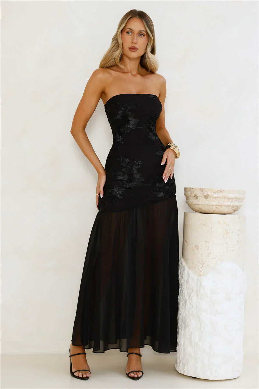 The Timeless Affair Strapless Mesh Maxi Dress features a stretchy mesh bodice with intricate embroidered details, and a sheer flowy skirt, creating an effortlessly elegant look. Style with heels.