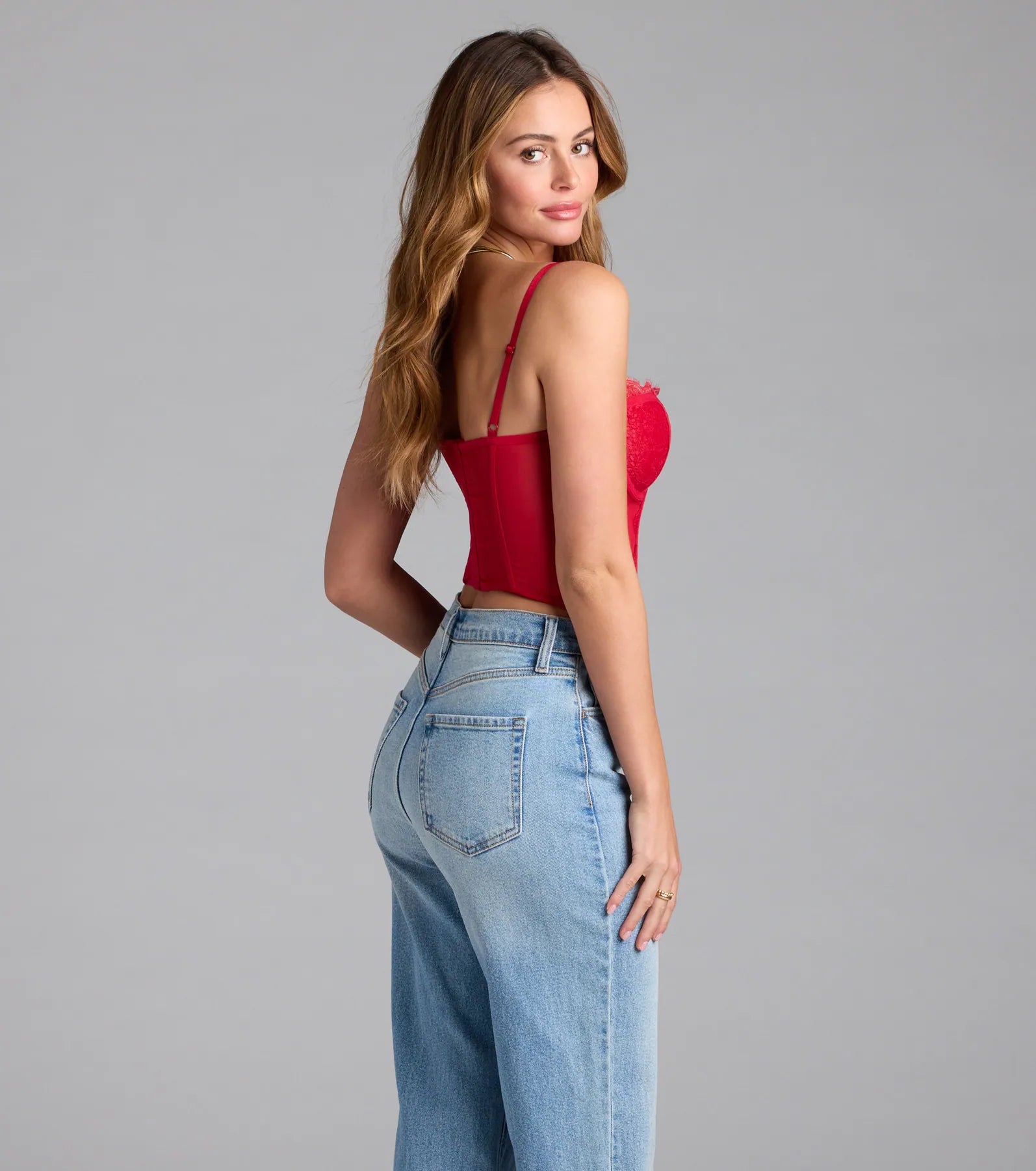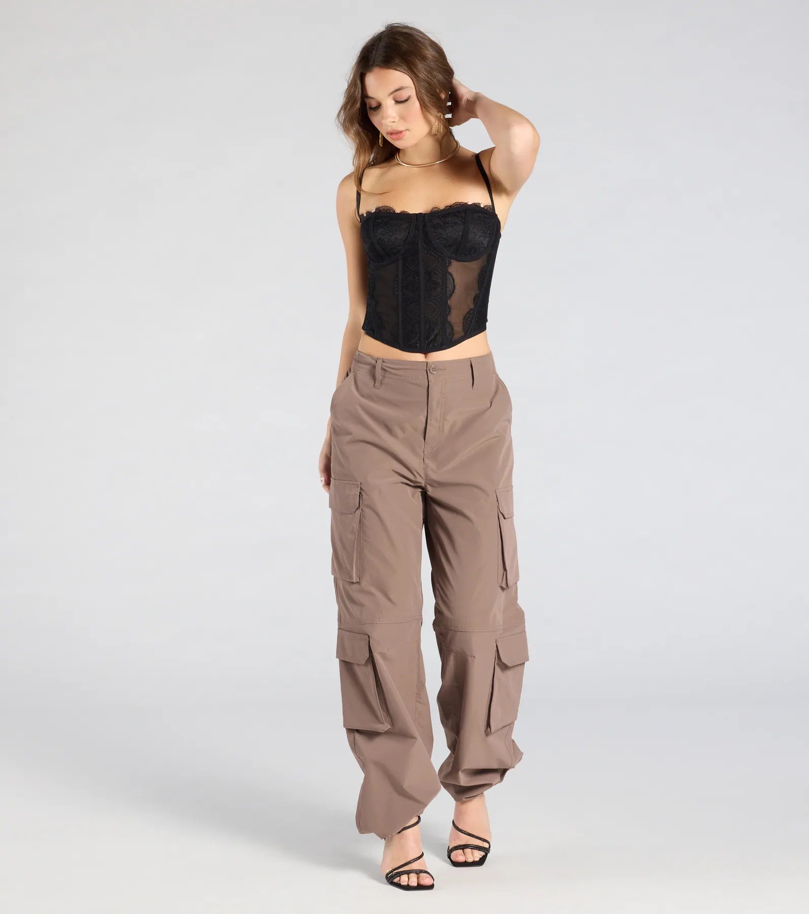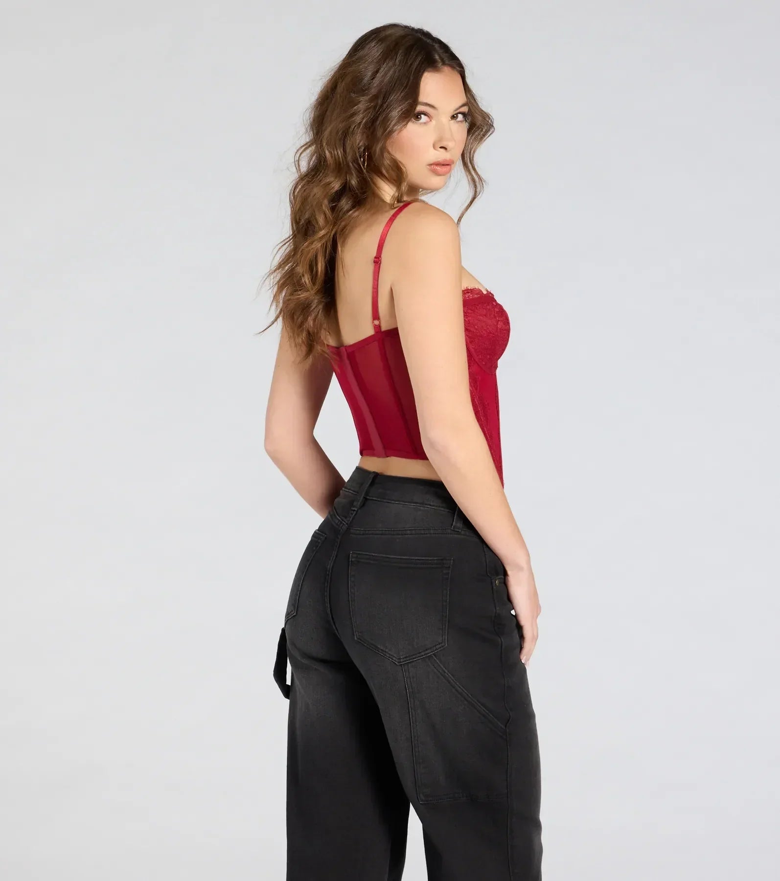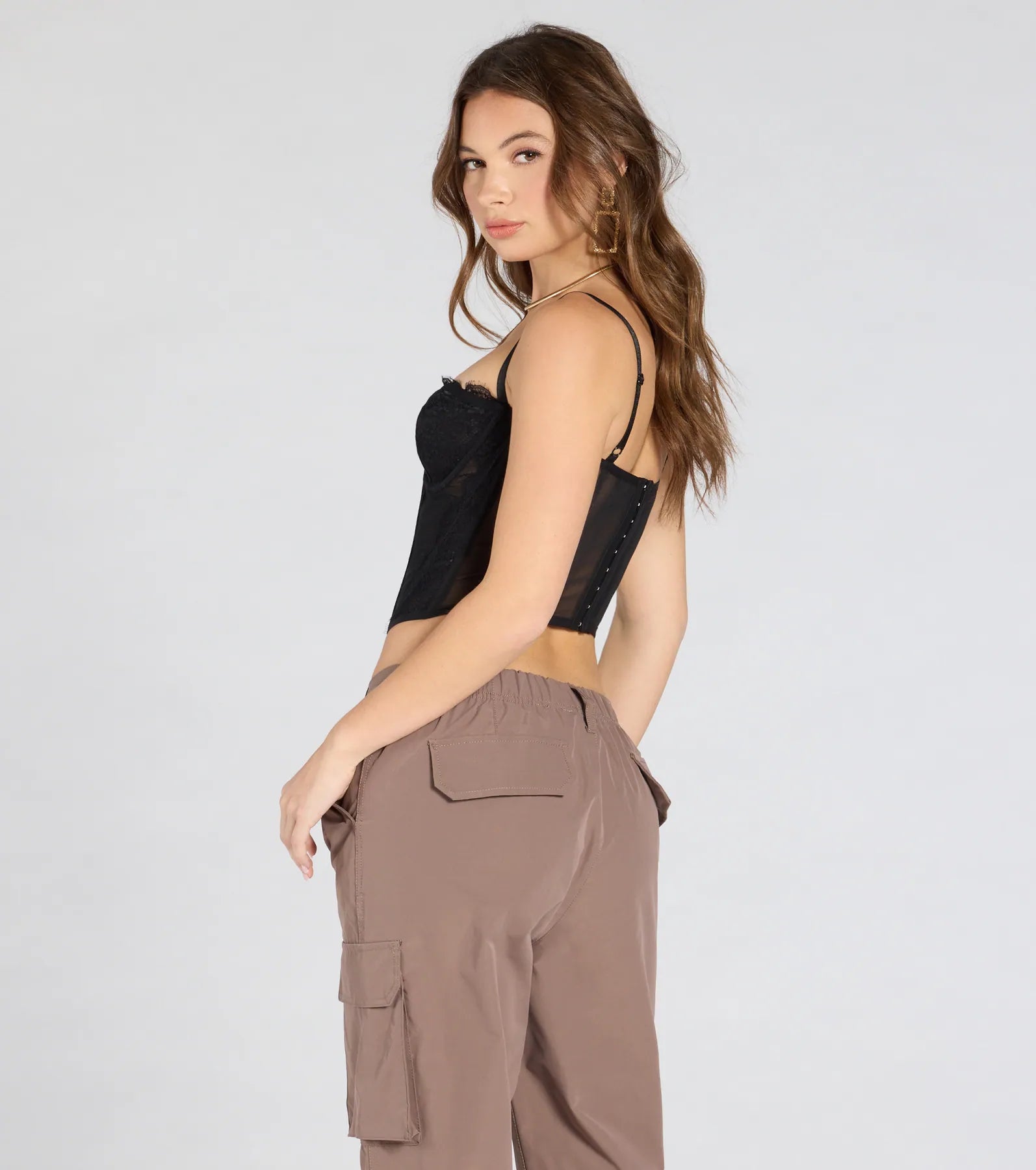 Deliver total bombshell vibes in this lace corset top for a date or girl's night! This sleeveless corset is made to stun and boasts a flattering square neckline and sheer mesh sides to show skin along the sleek cropped hem. Pair with cargo pants.