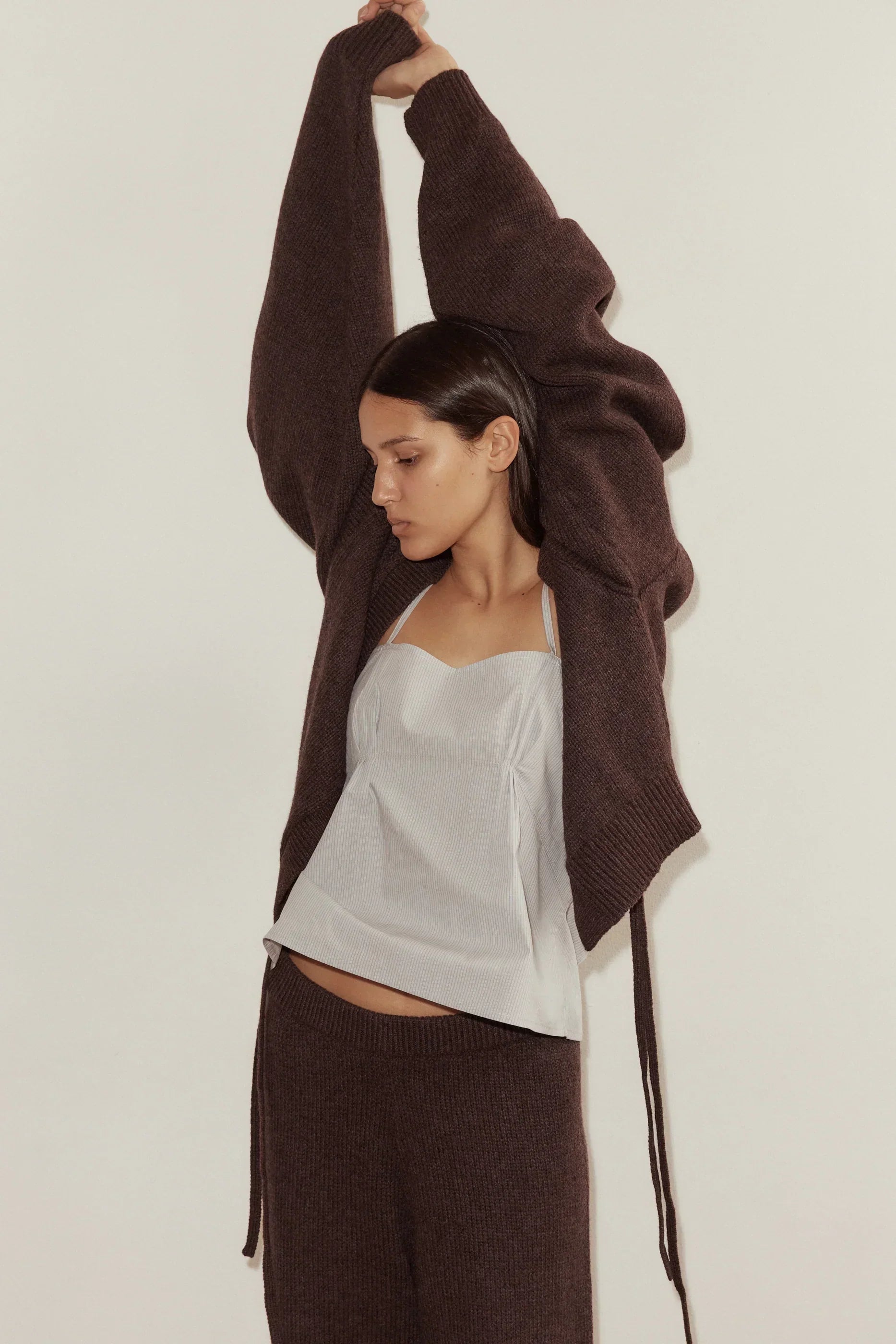 a mottled textured cardigan in a sustainable wool blend featuring a v neck front with two self fabric ties. dropped shoulder and a wide tapered arm for a relaxed look. ribbed hem and oversized fit for layering