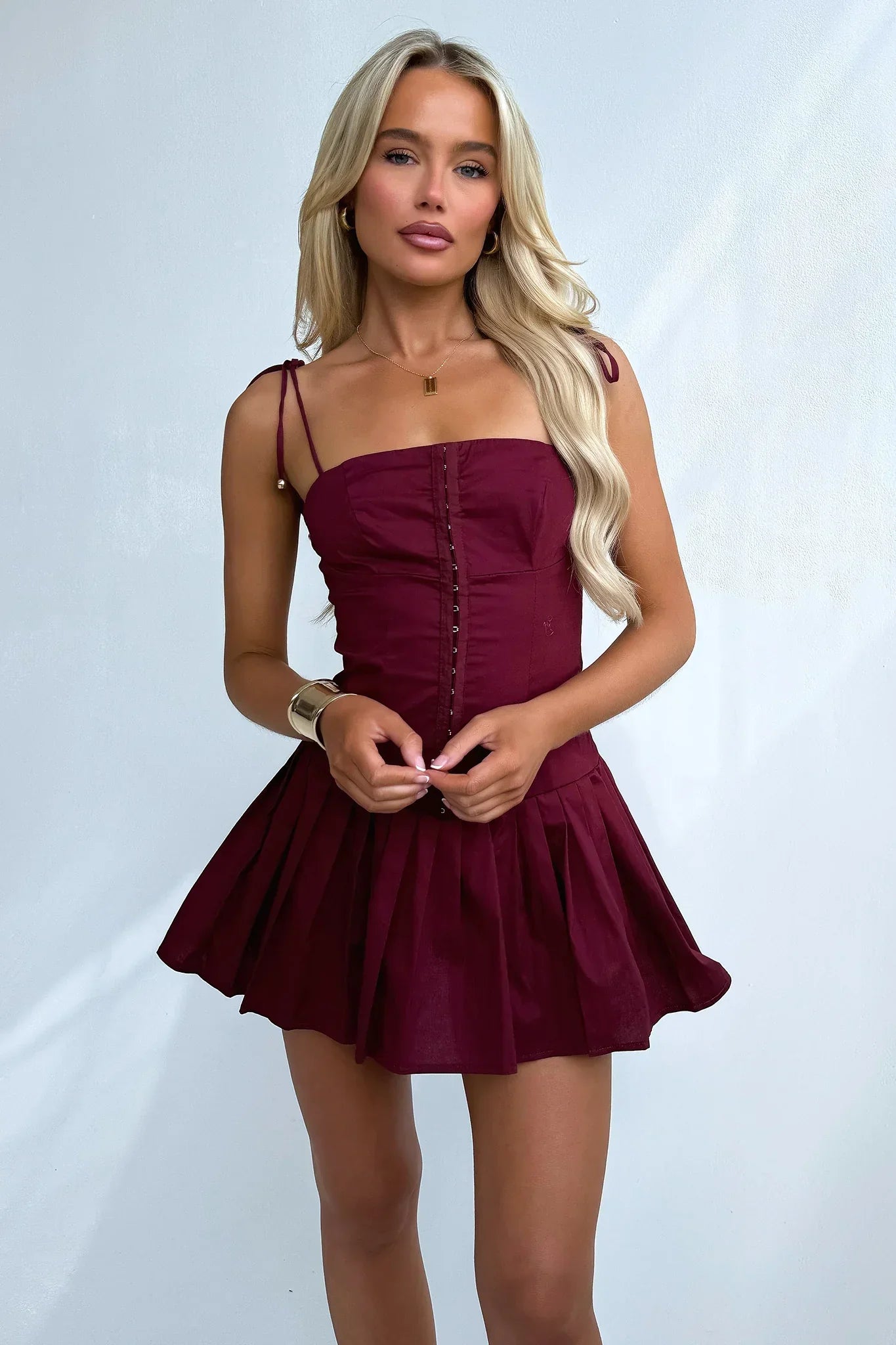 The Yaz Dress is a fun and flirty mini dress with a pleated skirt and built-in shorts for added comfort and convenience. The hook and eye bust and tie shoulder straps add playful details, while the silicone tape on the inside of the neckline keeps everything in place. Pair with heels and gold jewelry for a stylish look!